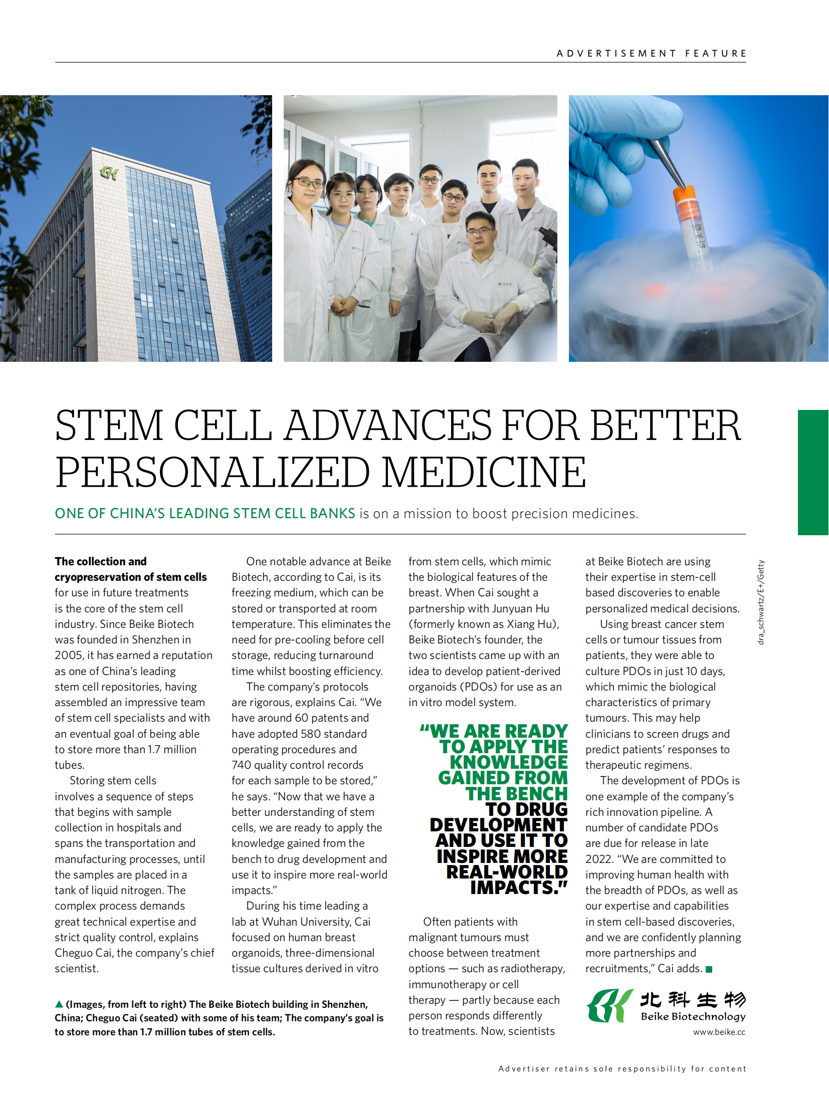 2022年6月29日,《Nature》官網(wǎng)nature spotlight增刊的“自然聚焦-中國精準醫(yī)療”板塊在線發(fā)表了北科生物首席科學家蔡車國教授團隊的主題文章:干細胞進展推動更好的個性化醫(yī)療。干細胞進展推動更好的個性化醫(yī)療