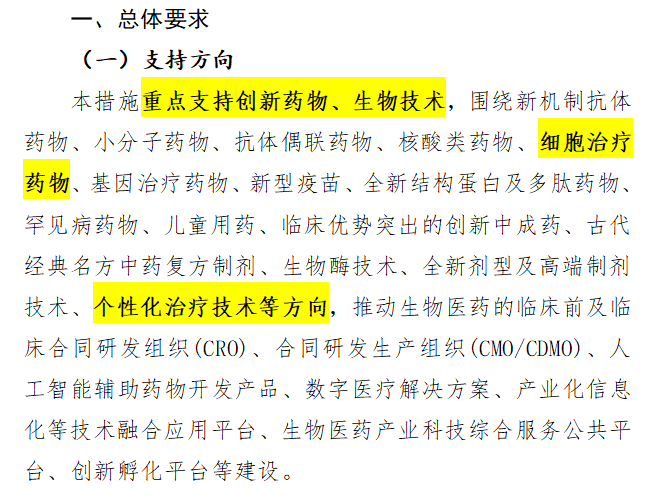 《措施》總體要求,重點(diǎn)支持創(chuàng)新藥物、生物技術(shù),圍繞…細(xì)胞治療藥物、基因治療藥物、新型疫苗……個性化治療技術(shù)等方向的發(fā)展。