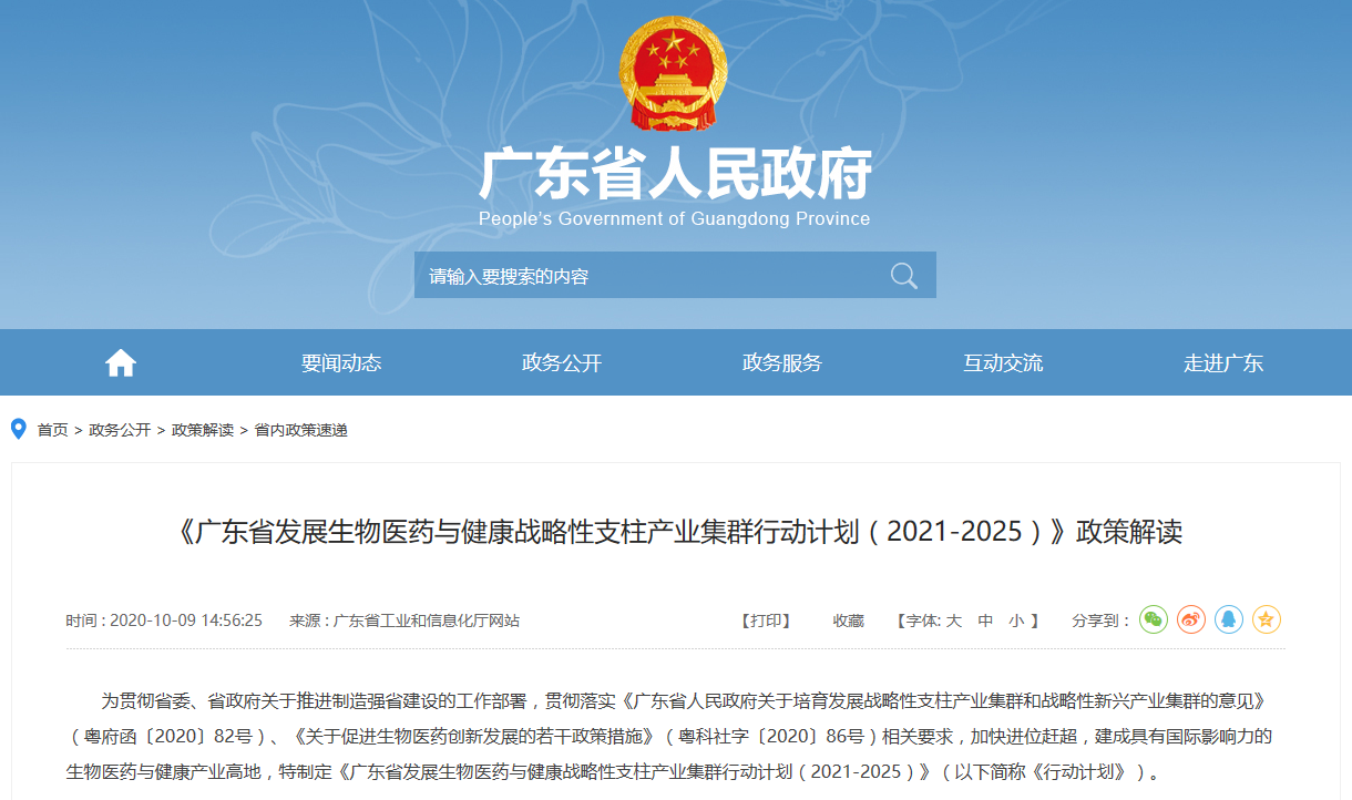 近日,廣東省科學(xué)技術(shù)廳、發(fā)展和改革委員會、工業(yè)和信息化廳、衛(wèi)生健康委員會、市場監(jiān)督管理局等五部門聯(lián)合發(fā)布《廣東省發(fā)展生物醫(yī)藥與健康戰(zhàn)略性支柱產(chǎn)業(yè)集群行動計(jì)劃(2021-2025年)》。