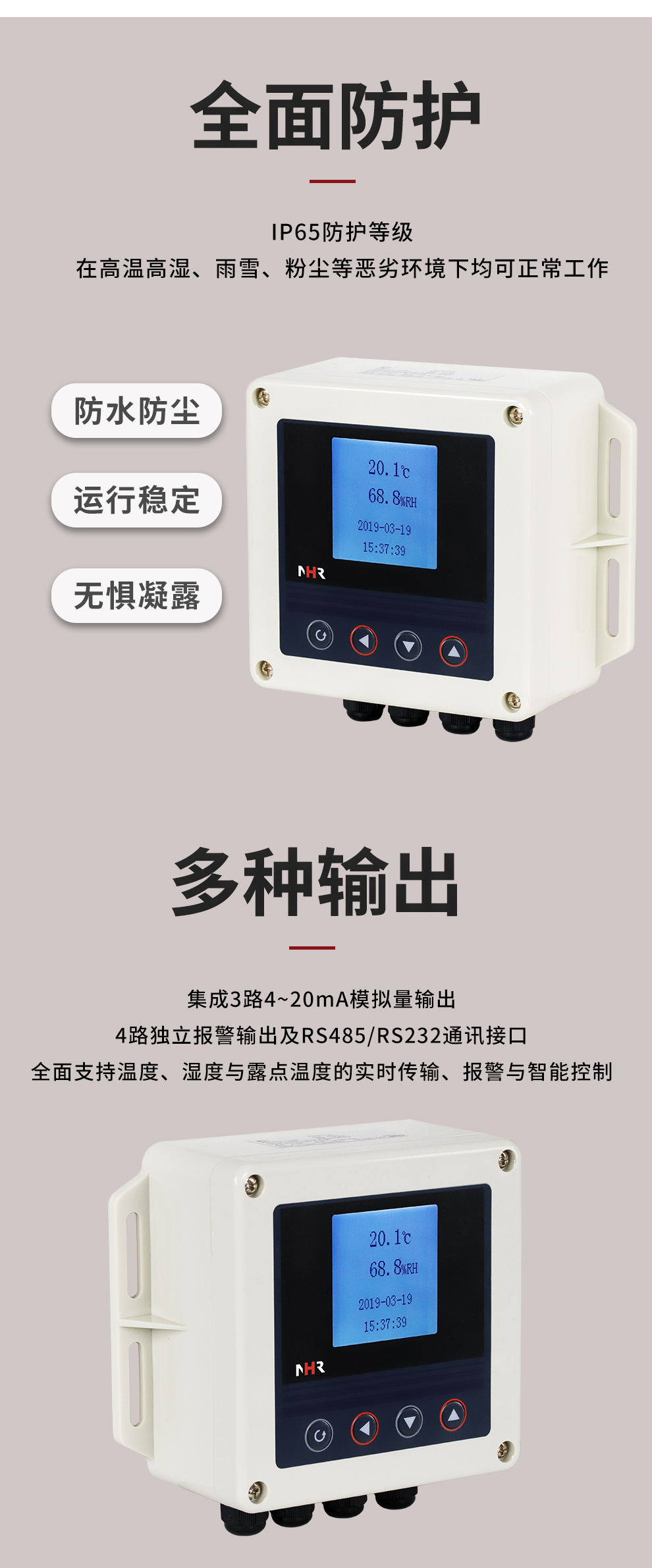 虹潤公司是專業(yè)生產(chǎn)環(huán)境監(jiān)測儀表的國家專精特新“小巨人”企業(yè)。生產(chǎn)的壁掛式溫濕度控制器,具有溫度、濕度、露點高精準的測量,多種輸出類型,穩(wěn)定性強,RS485/RS232通訊,IP65防護等級等特點。產(chǎn)品獲得一種手持式低功耗溫濕度檢測儀、大屏幕溫濕度記錄儀等2項國家發(fā)明專利,主持起草物聯(lián)網(wǎng)智能溫度儀表通用技術條件、冷鏈溫度記錄儀等2項國家標準,通信系統(tǒng)多通道數(shù)據(jù)采集控制終端規(guī)范軍用標準,以及現(xiàn)場設備集成等5項智能制造國家標準,參與國際5G標準制定,取得溫濕度儀表等2項相關軟件著作權。產(chǎn)品廣泛應用于工業(yè)現(xiàn)場、農(nóng)業(yè)大棚、倉儲物流、地下管廊、養(yǎng)殖孵化、配電機房等諸多領域。