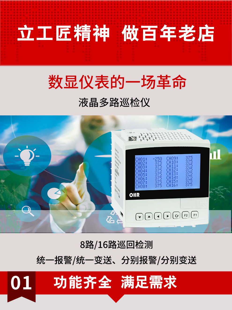 虹潤公司是專業(yè)生產(chǎn)多路溫度巡檢儀的國家專精特新“小巨人”企業(yè),生產(chǎn)的液晶多路巡檢儀,具有8路/16路測量通道,全切換信號輸入,統(tǒng)一報警統(tǒng)一變送輸出,分別報警分別變送輸出,RS485/RS232通訊等特點。產(chǎn)品獲得巡回檢測顯示方法及裝置、儀表殼體等2項國家發(fā)明專利,主持起草工業(yè)過程控制系統(tǒng)用模擬輸入兩位或多位輸出儀表、物聯(lián)網(wǎng)智能溫度儀表通用技術(shù)條件等2項國家標(biāo)準,以及通信系統(tǒng)多通道數(shù)據(jù)采集控制終端規(guī)范軍用標(biāo)準,參與國際5G標(biāo)準制定,取得液晶多回路測量顯示控制儀等4項相關(guān)軟件著作權(quán)。產(chǎn)品廣泛應(yīng)用于電力、石化、冶金、制藥、水處理、機械配套等各種工業(yè)現(xiàn)場。