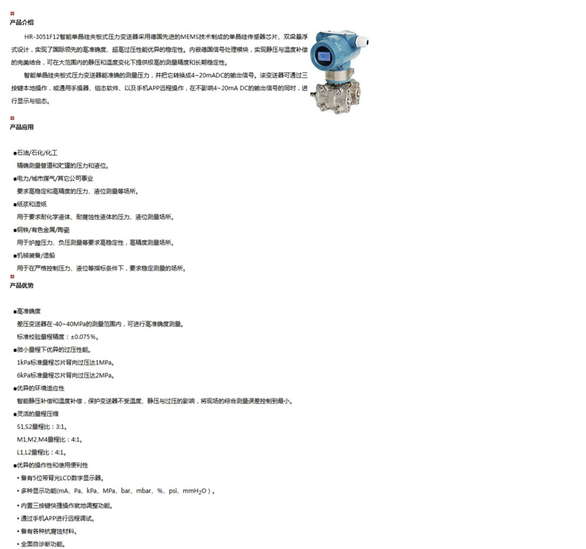 HR-3051F12智能單晶硅夾板式壓力變送器