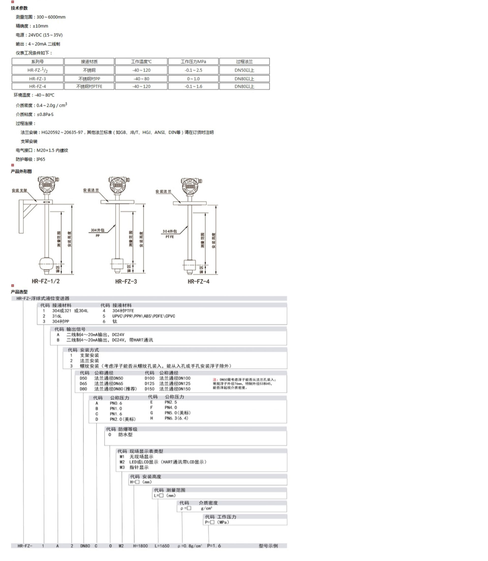 HR-FZ系列浮球式液位變送器,用于將容器內(nèi)的介質(zhì)液位變送為4~20mA二線制標(biāo)準(zhǔn)信號輸出。另外,變送器還可以提供現(xiàn)場指示。
